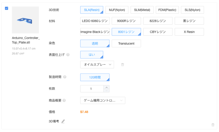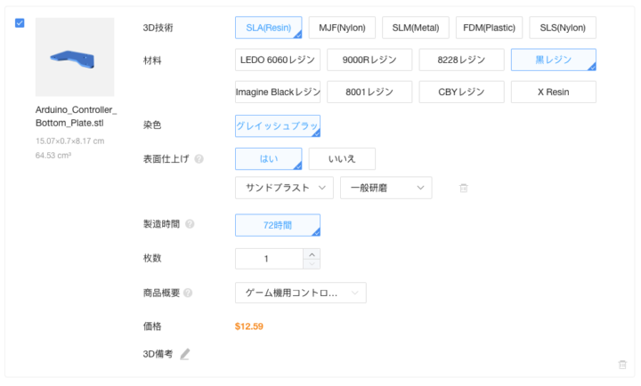 またボトムプレートは[黒レジン]を選択し表面仕上(後処理)ありを選択し製造しました。