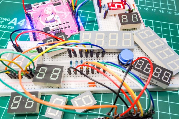 7セグメントLEDの点灯方法には他にもシフトレジスタを使った表示方法やシリアルドライバ内蔵のモジュールなどもあり、これらを使えばより少ない配線で接続する事もできます。