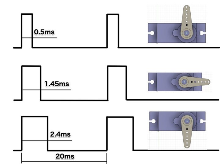 サーボモーターの制御には、PWM(Pulse Width Modulation)というパルス幅変調方式という制御方法が使われています。