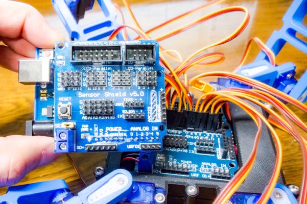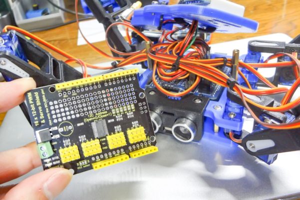 サーボの数が多いのでセンサーシールドを使い接続しその配線はシンプルに接続できました。