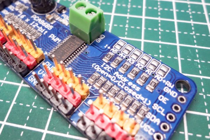 またアドレス選択パッドをはんだブリッジする事によりI2Cアドレスの変更が可能で、62台のPCA9685を接続し最大992台のサーボモーターを同時に制御することも理論的には可能となります。