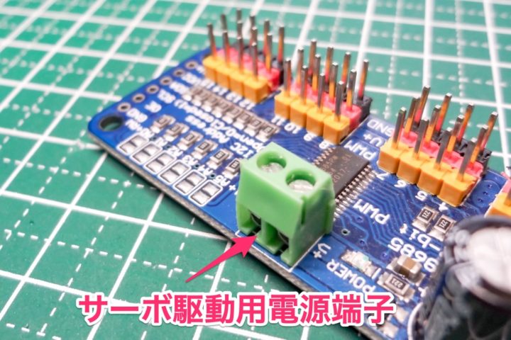 I2C通信対応のドライバとなりArduinoとの接続は簡単で占領するGPIOピンも少なくなるので多くのサーボモーターを制御する際は非常に有効な手段になるかと思います。