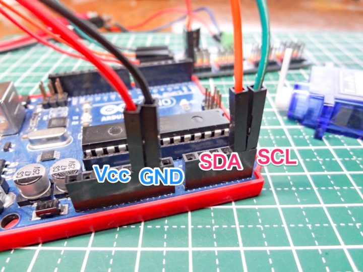 I2C通信に対応したデバイスとなり、SCL・SDA・Vcc・GND端子をArduinoに接続して使う形となります。