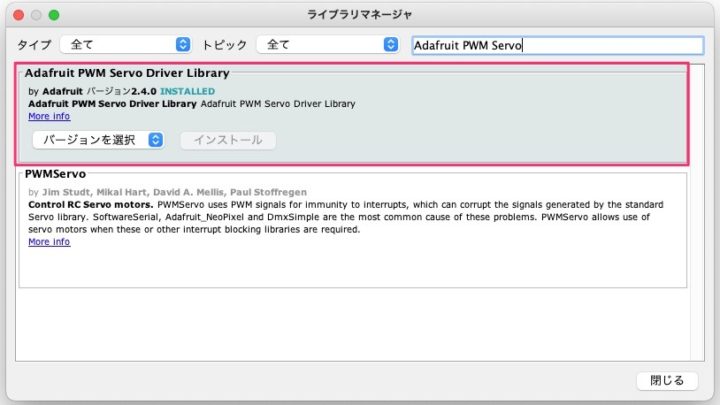 PCA9685サーボモータードライバを制御するためのライブラリとして今回、『Adafruit PWM Servo Driver library』を使用します。
