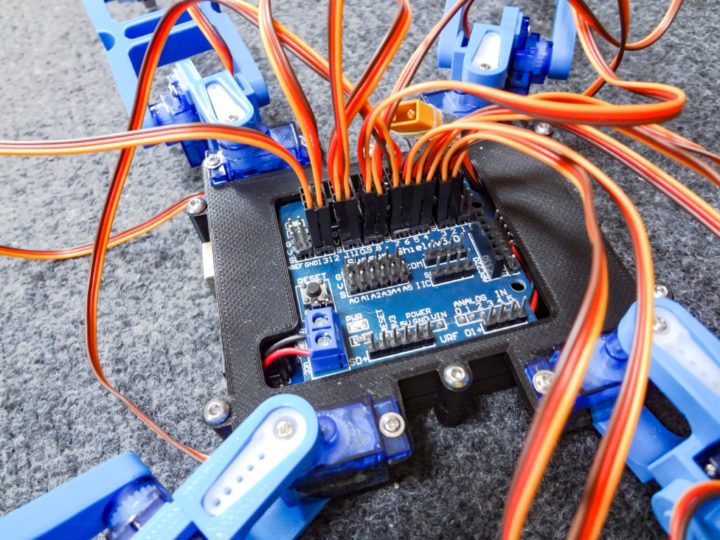 例えばこちらは3Dプリンタでパーツを作成した3関節の4脚ロボットとなります。