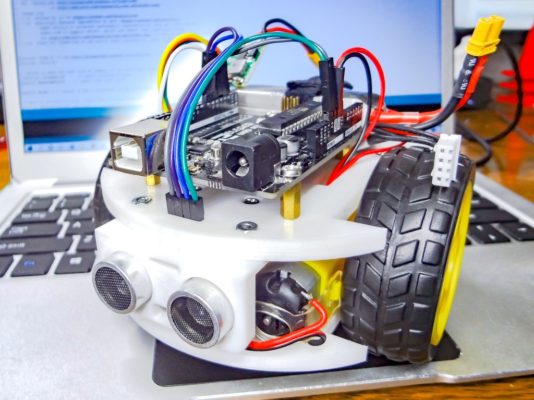 Arduino Uno・L298Nモータードライバ・DCモーター・超音波センサーHC-SR04というシンプルな構成の小型ロボットカーとなります。