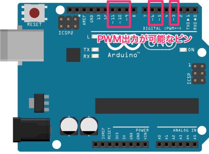 「〜」マークが付いたD3/D5/D6/D9/D10/D11端子はPWM制御で使えるピンとなり、ON/OFFのみのデジタル処理では出来ない、例えばLEDをゆっくり点灯や消灯させたりといったアナログ的な制御が可能な端子となります。