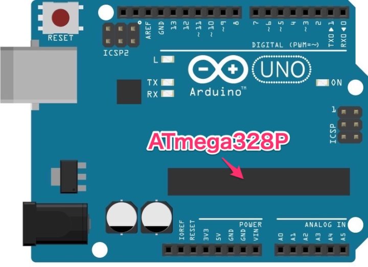 まずこちらがArduino Unoの心臓部にあたるマイコンでATmega328Pという型番のチップとなります。