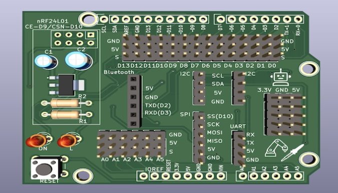 そんな事で今回はArduino Unoに接続できる無線モジュール用のシールドを作ってみました。
