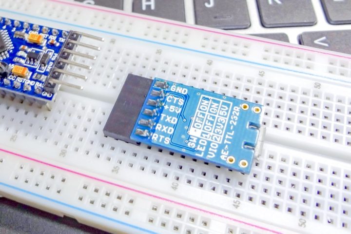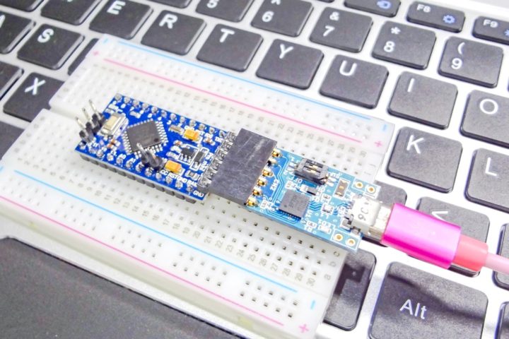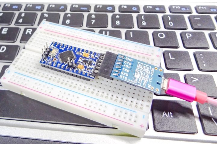 そして先述のようにArduino Pro MiniにはPCと接続しスケッチを書き込む際に必要となるUSB-シリアル変換器が搭載されていません。