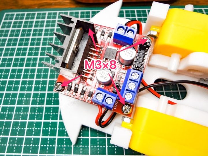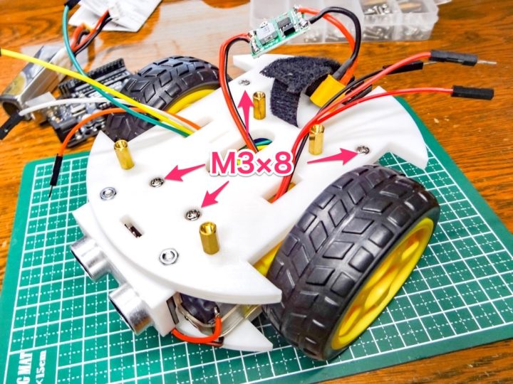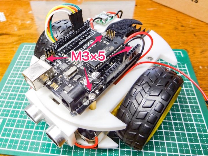ボディー上パーツをM3×8ビスで固定し、Arduino UnoをM3×5ビスで取り付けます。