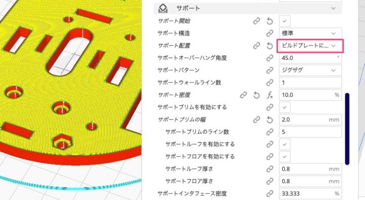3Dプリンタで出力する際に基本的にサポートが入らない形状で作っていますが、ボディー底面にはネジ穴が多数空いているのでスライサーのサポート設定で[ビルドプレートにタッチ(Curaの場合)]を選択し底面のみサポートを入れて出力させた方がネジ穴は綺麗に仕上がります。