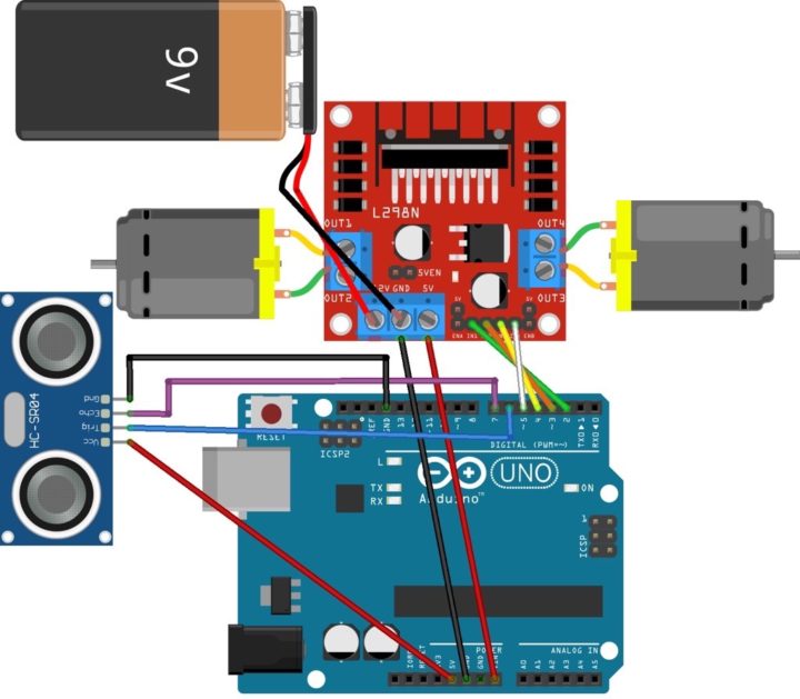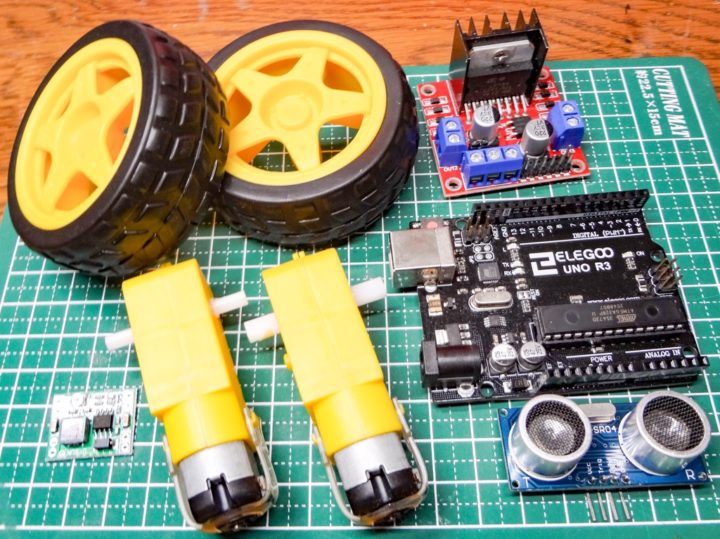 Arduinoであらかじめプログラムした動きをさせるのが基本動作となりますが、超音波センサーHC-SR04を使い障害物を検知して自動運転させる事もできます。