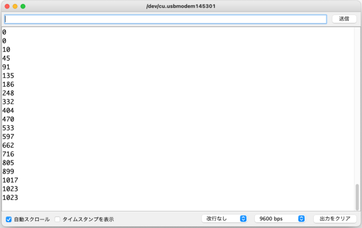 10ビットの分解能、つまり2の10乗なので1024段階の数値として入力されたアナログ値を扱うことが出来るようになっています。(ESP系のマイコンボードでは12ビットとなっています)