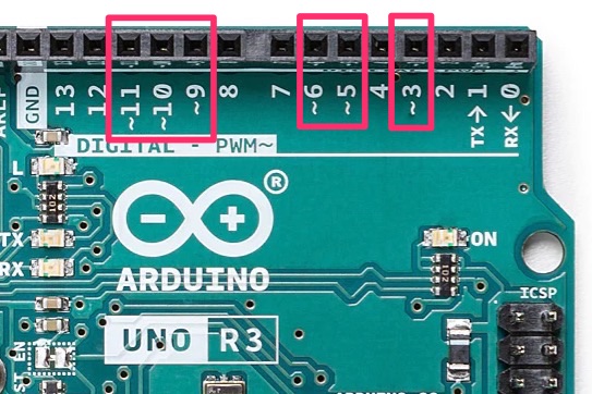 Arduinoのアナログ出力(PWM出力)が出来る端子はボードにより変わってきますが、マイコンチップにATmega328Pを使っているボードではデジタルピンD3/D5/D6/D9/D10/D11で使うことが出来ます。