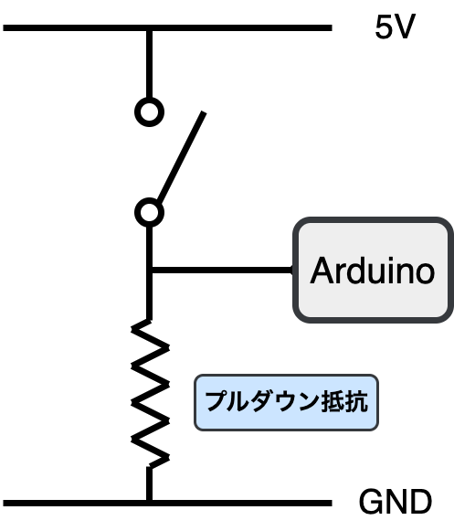 上記回路ではスイッチが押されている状態では5Vが入力されHIGH状態が確定されますが、スイッチが押されていない時にはフロートと呼ばれる開放された状態になってしまいます。(デジタル端子に何も繋がっていない状態)