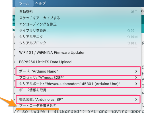 そして[シリアルポート]はPCに接続しているArduino Uno(書き込む側)を選択、ブートローダーを書き込む対象は今回Arduino Nanoなので[ボード]は[Arduino Nano]を選択します。