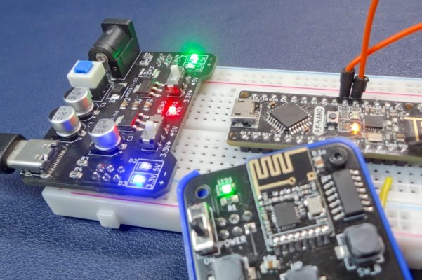 このような電源ボードがあれば、ちょっとしたテストやプロトタイプ回路を組む時に安定化電源などを用意する必要がなく手軽に電源供給が行えるので重宝しています。