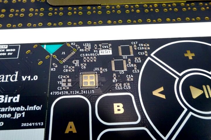 これも金メッキを露出させて作れればさらにカッコ良くなると思うのですが、このサイズの基板にタッチパッドを作ると大きなベタを作ることが出来ないのでシルクにしています。