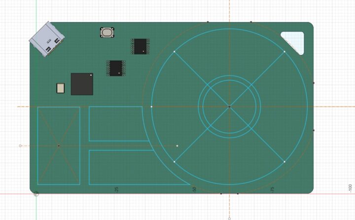 まずCAD上でタッチキーのパッドサイズや形状、主要な電子パーツを配置した全体イメージを作り名刺サイズの基板(55mm×91mm)として設計出来るのか確認していきました。