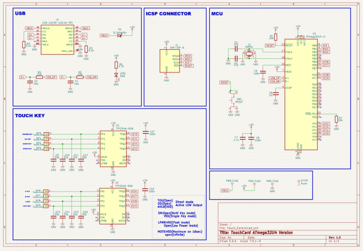 全体の回路構成は、ATmega32U4まわりの回路に各パッド(スイッチ)と繋がったタッチセンサーIC TTP224を接続したシンプルな構成で実現することが出来ました。