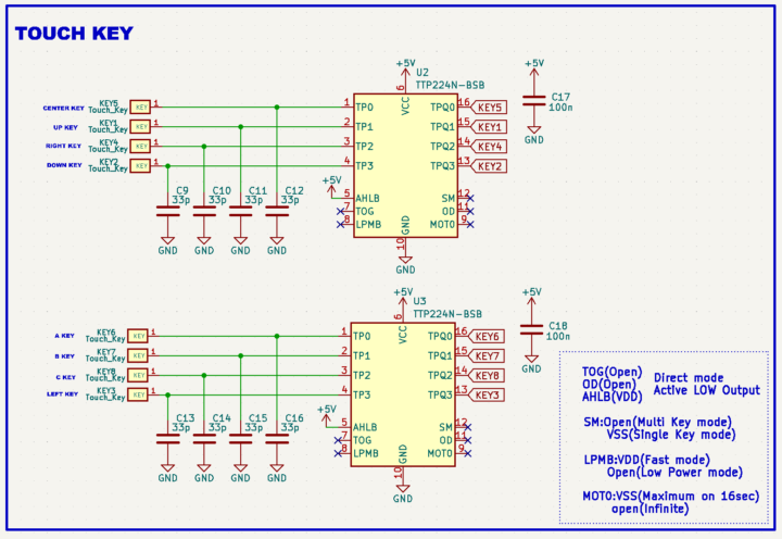 あとタッチパッドに接続したTTP224の入力ピン(TP0~TP3)に接続したコンデンサの容量により感度調整ができ、33pFの定数としています。