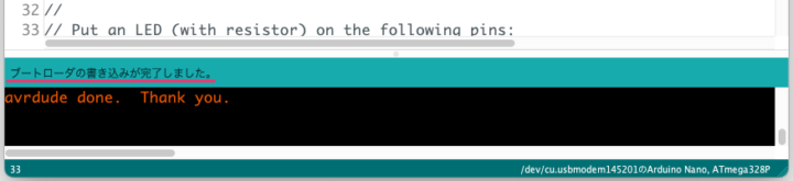 ブートローダーの書き込みが完了したら通常通りUSB端子からのスケッチ書き込みが行えるようになります。