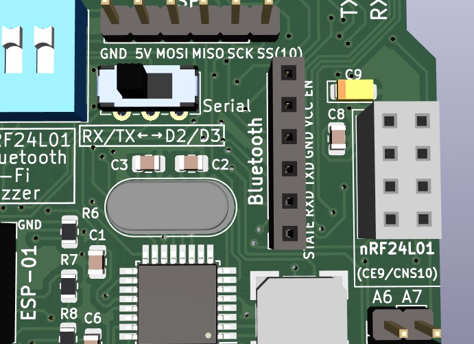 Wi-FiとBluetoothモジュールは共にUARTでの接続モジュールなので同時接続は想定しておらず接続端子も干渉する位置関係になっています。
