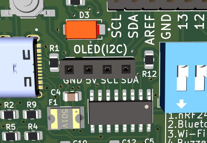 ディスプレイは一般的によく使われる4PタイプのI2C接続のものにピンの並びを配置しています。