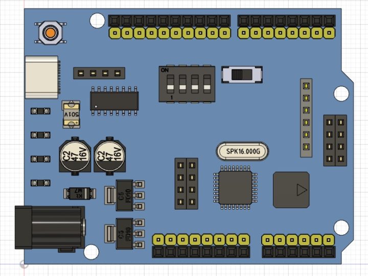 Arduino Uno互換ボードとして製作を考えておりそこそこ大きなボードサイズのように思いますが、CAD上にパーツを配置してみると結構これが大変、接続したモジュールが干渉しないように配置するとI/Oラベルなどを書き込むスペースが無くなってしまいます。