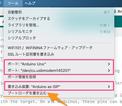 ブートローダーを書き込む対象は[Arduino Uno]、そして書き込み装置を[Arduino as ISP]に設定。