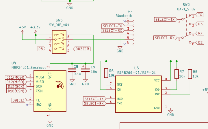 無線モジュールESP-01やnRF24L01は3.3V動作でのモジュールですが、信号ラインのレベルシフト回路は入れていません。