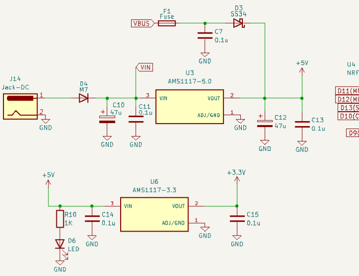また電源ラインは本家UnoではオペアンプとMOS-FETを使ってUSB端子からの給電とDCジャック(またはVIN端子)からの給電を電圧により上手く切り替える構成で作られていますが、5Vおよび3.3Vレギュレーターを使ったシンプルな構成にしています。
