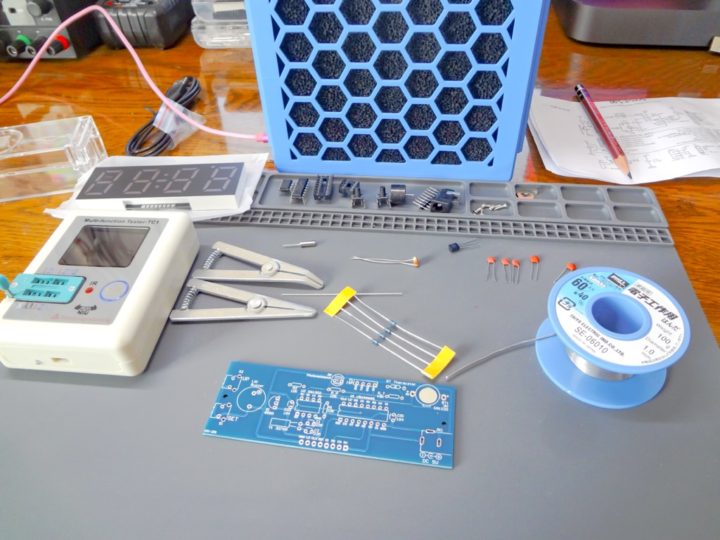 抵抗・コンデンサ・トランジスタ・IC・4桁表示の7セグメントLEDなどを基盤にはんだ付けしていくキットとなります。