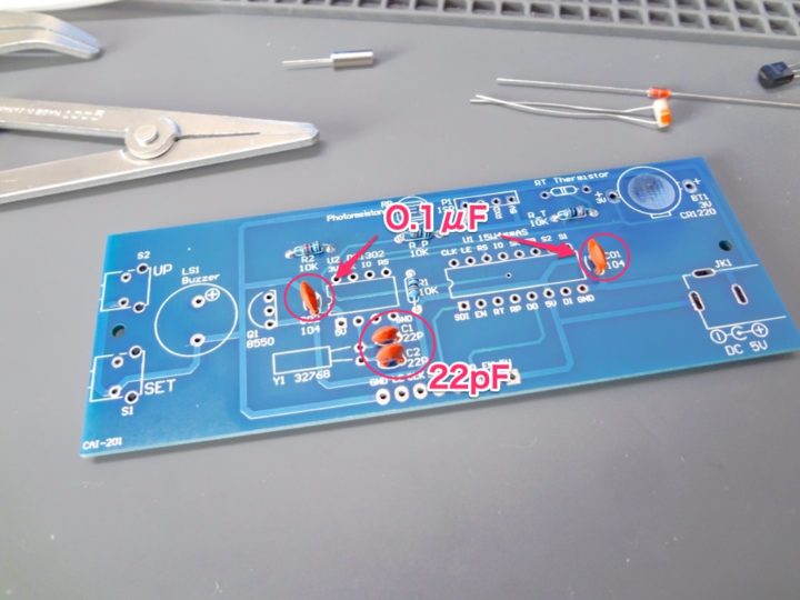 セラミックコンデンサが0.1μF(104と印字されたもの)と22pF(22と印字)が各2本ずつ計4本取り付けます。(22pFは予備が1本入っていました)