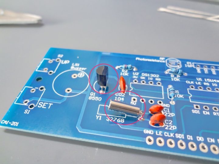 次にトランジスタと水晶振動子を取り付けます。