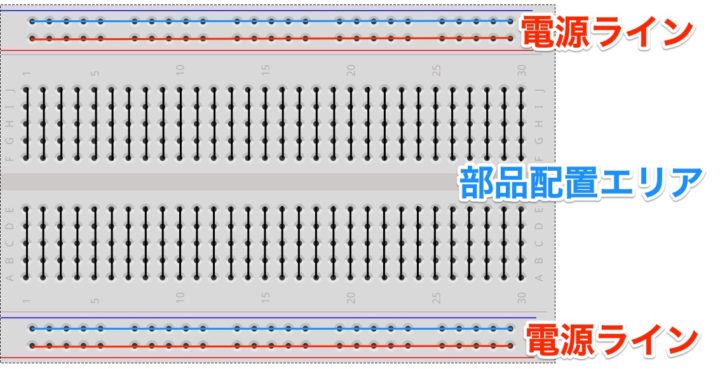 基本的にどのタイプのブレッドボードにも左右にこの電源ラインが付いていますが、ブレッドボードの種類によっては片側にしかないものもあります。
