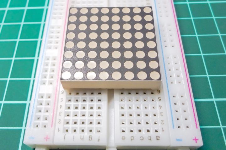 例えば、このようなマトリクスLEDを通常のブレッドボード(左右5列ずつ)に指すと左右両サイドいっぱいに占領してしまいジャンパーワイヤを挿せる場所がなくなってしまいます。