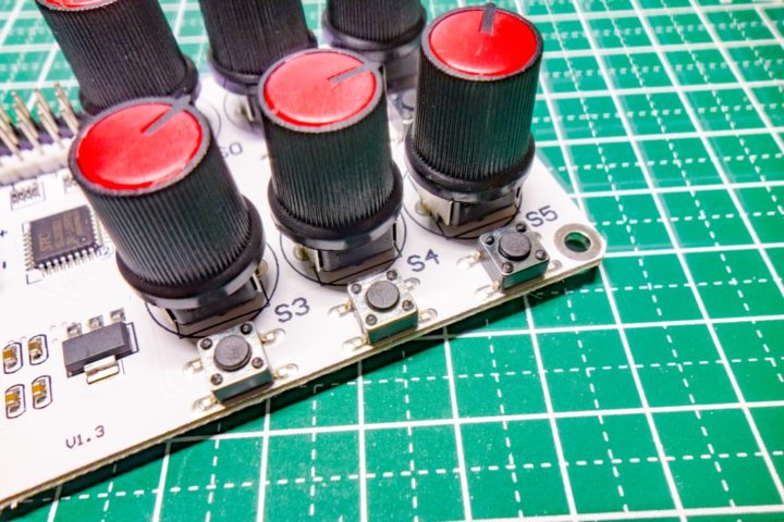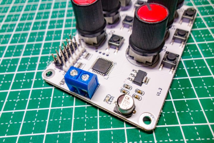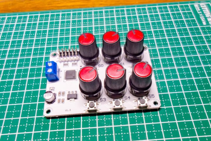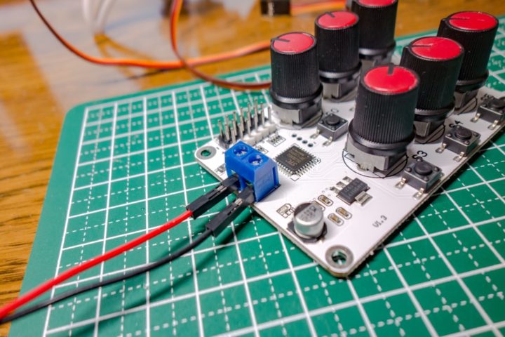 電源端子にサーボ接続用端子、6つのポテンショメーター、モード切替スイッチとシンプルな構成となっています。