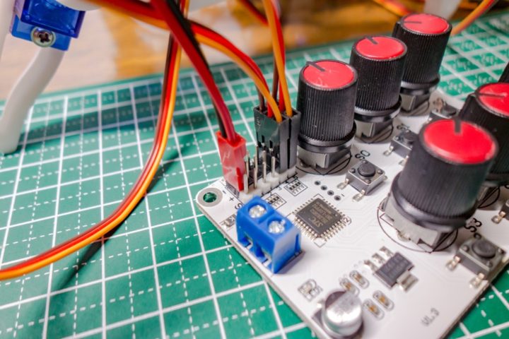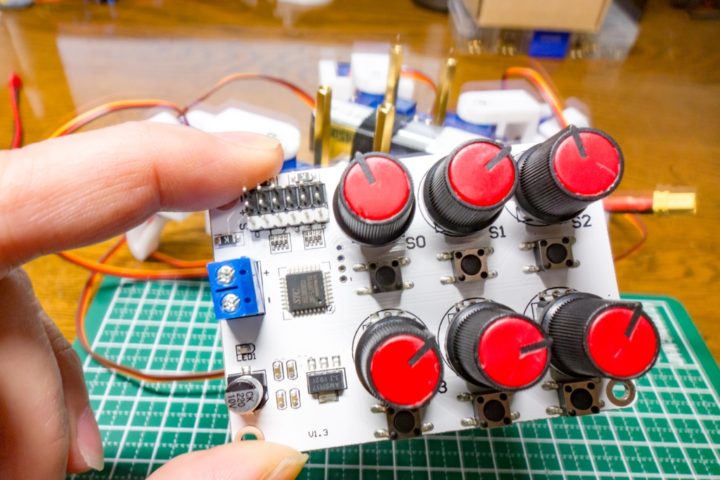 使用するサーボモーターの動作電圧を電源端子につなげれば、あとは出力端子(Vcc・GND・信号線の3ピン端子)にサーボモーターを繋げればニュートラルの位置を確認したり、またポテンショメーターを回して任意の角度まで動かし動作チェックなどを行うことが出来ます。