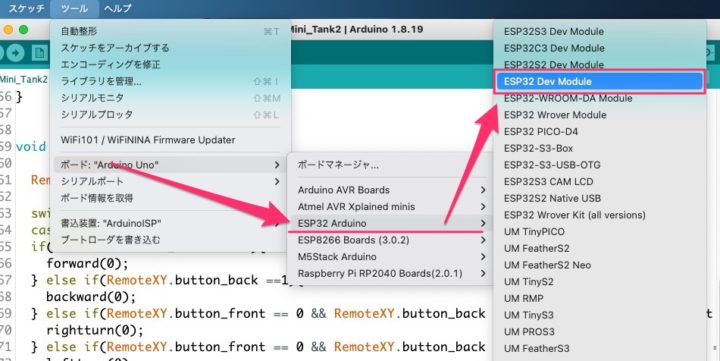 インストールが完了すると、[ツール]→[ボード]一覧に[ESP32 Arduino]という項目が追加されます。