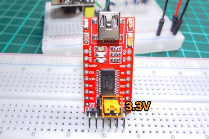 ESP-01は3.3V動作のモジュールなので、USB-シリアル変換モジュールの出力を3.3Vに設定しておくのをお忘れなく!