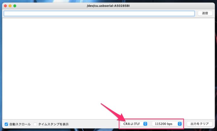通信速度(ボーレート)を[115200bps]、[CRおよびLF]に設定します。