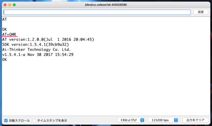 ボックスに[AT+GMR]と打ち込むとESP-01に書き込まれているファームウェアの確認が出来ます。