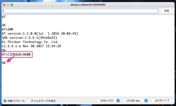 冒頭でお話したように、ESP-01のデフォルトのボーレート(通信速度)は115200bpsとなっています。