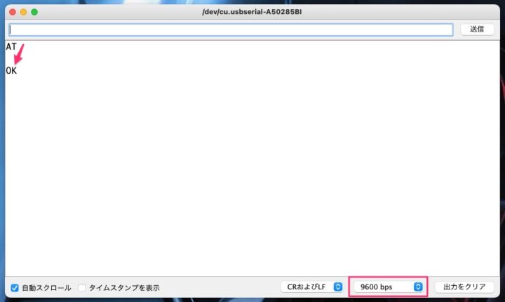 ボーレートを9600bpsに変更したのでシリアルモニタの通信速度を9600bpsに変更し、同様に[AT]と打ち込み[OK]とリターンがあればボーレートが9600bpsに問題なく変更されているのが確認できます。