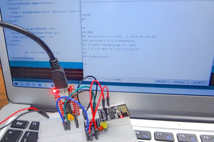 ESP8266(ESP-01)は初期状態ではATコマンドを受け付けるファームウェアが書き込まれていて、Arduinoなど無線機能を持たないマイコンボードと接続するWi-Fiモジュールとして使うことが出来ます。