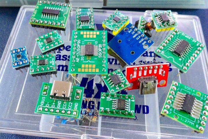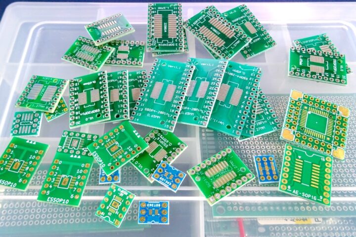 ピッチの狭いICチップやマイコンチップなどを扱う場合、ブレッドボードやユニバーサル基板に直接実装出来るように2.54mmピッチに変換する基板がよく使われます。