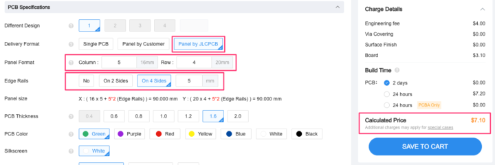 JLCPCBでは単一基板の一辺が15mm未満になると15.2ドルのオプション料金が加算されてしまいます。