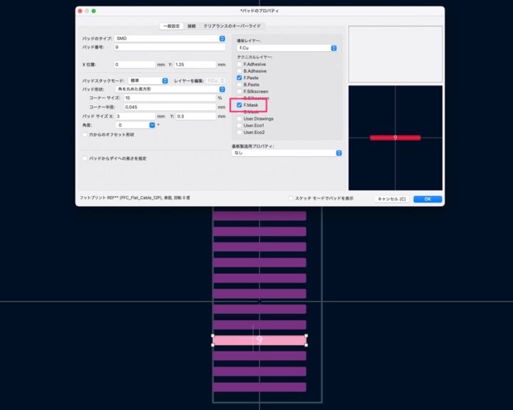 現状のパッド配置では、各パッドの上にソルダーマスクがかかっている状態です。